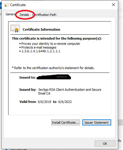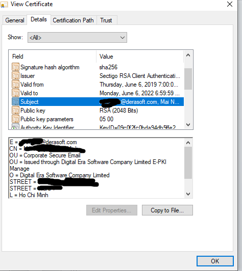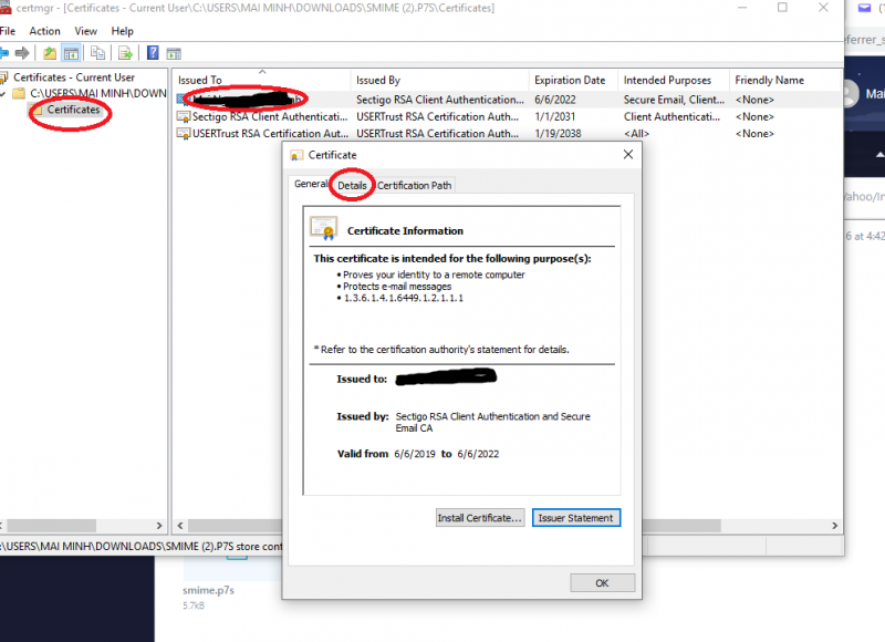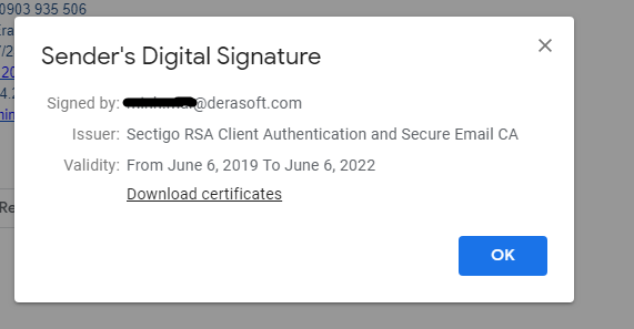 Bạn có thể nhấn "Download certificate" để tải về chữ ký số của người gửi. Lưu ý: File tải về có đuôi là .pem. Bạn hãy đổi đuôi của file sang .cer để Windows có thể đọc được dễ dàng.