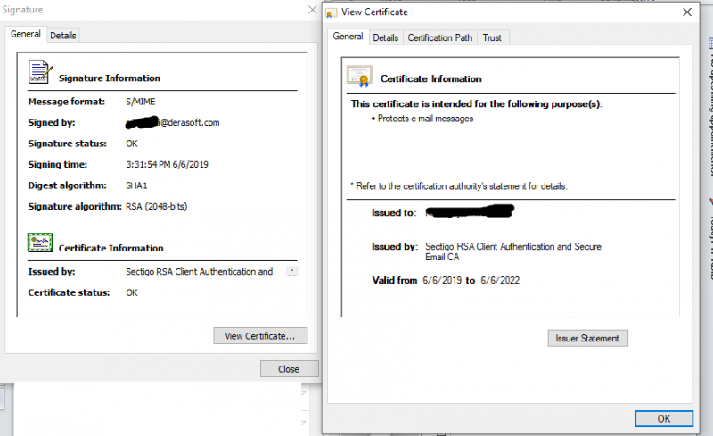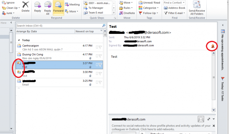 Đối với Outlook, bạn sẽ dễ dàng nhận ra dấu hiệu của một email được ký số qua một icon có hình dạng chứng thư như hình bên dưới. Khi mở email được ký số, bạn có thể click vào biểu tượng chứng thư để xem thông tin chi tiết chữ ký số đã được dùng để ký cho email đó. Lưu ý: Chữ ký số cho email có hai dạng xác thực là cá nhân và doanh nghiệp. Một chữ ký số với đầy đủ thông tin doanh nghiệp được xác thực sẽ không thể bị giả mạo và có độ tin cậy cao hơn nhiều so với một chữ ký số cá nhân.