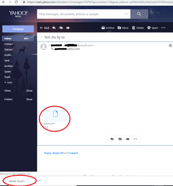 Một email được ký số khi gửi đến Yahoo thì chữ ký số sẽ được chuyển thành một file đính kèm có tên là "smime.p7s". Bạn hãy nhấp vào file đính kèm để tải về máy tính. Windows mặc định sẽ có thể đọc được định dạng file .p7s.