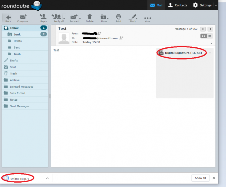 Hiện nay, hầu hết các phần mềm Webmail đều đã hỗ trợ nhận dạng chữ ký số. Tuy nhiên, giống như Yahoo, đa số các Webmail đều chuyển chữ ký số thành dạng file đính kèm có định dạng .pem hoặc .p7s. Đối với các file .pem thì bạn chỉ cần đổi đuôi sang dạng .cer là Windows có thể đọc được, còn các file .p7s thì Windows đã hỗ trợ sẵn. Hình dưới đây là một email có chữ ký số được mở bằng phần mềm Roundcube.