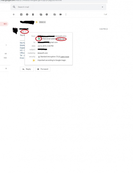 Gmail không có biểu tượng chứng thư giúp người dùng dễ dàng phân biệt các email được ký số. Bạn cần phải mở nội dung email được ký số, sau đó click vào biểu tượng "Show Details" có hình mũi tên ngay bên cạnh chữ "to me". Một popup sẽ hiện ra kèm theo dấu check màu xanh lá cây cùng cụm chữ "Verified email address". Bạn có thể nhấn chọn mục "Sender info" để xem hoặc tải về chữ ký số.