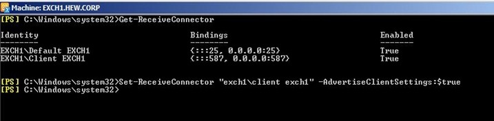 Set-ReceiveConnector –Identity "EXCH1\Client EXCH1" –AdvertiseClientSettings $True