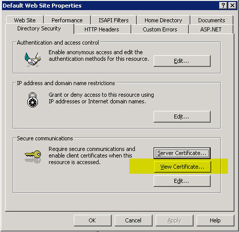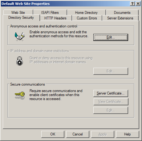 Chọn tab Directory Security. Trong mục Secure communications nhấn vào nút Server Certificate.