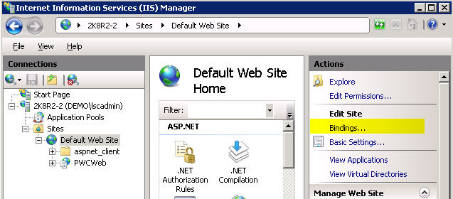 Chọn website cần binding SSL, sau đó nhấn chọn mục Bindings... ở menu bên phải.
