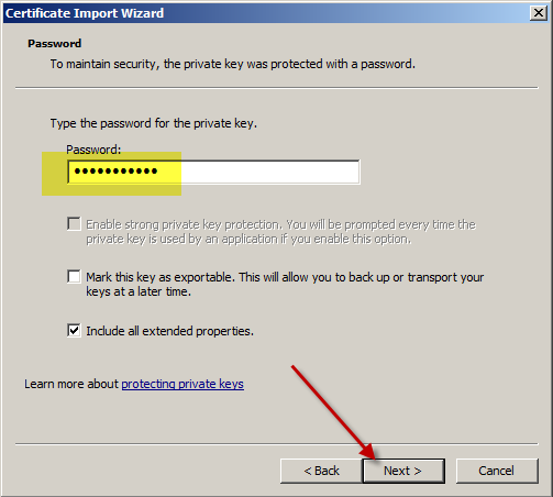 11. Nhập vào mật khẩu bảo vệ của file PFX. Chọn mục Include all extended properties. Lưu ý: Nếu bạn muốn cho phép export khóa riêng của chứng thư số này về sau, bạn cần chọn mục Mark this key as exportable. Trong trường hợp bạn có nhiều máy chủ, bạn chỉ nên cho phép export khóa riêng từ một máy chủ chính để gia tăng khả năng bảo mật.